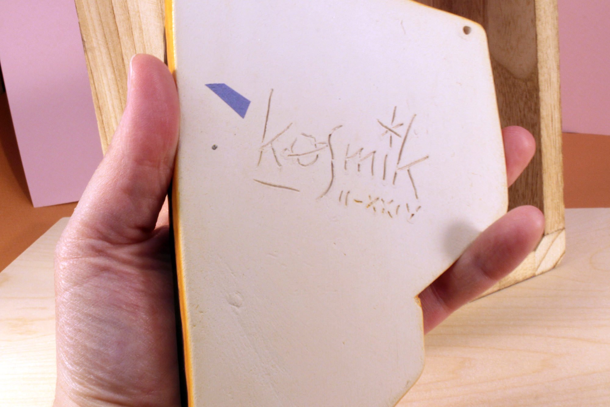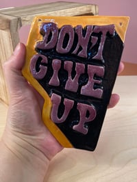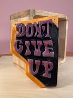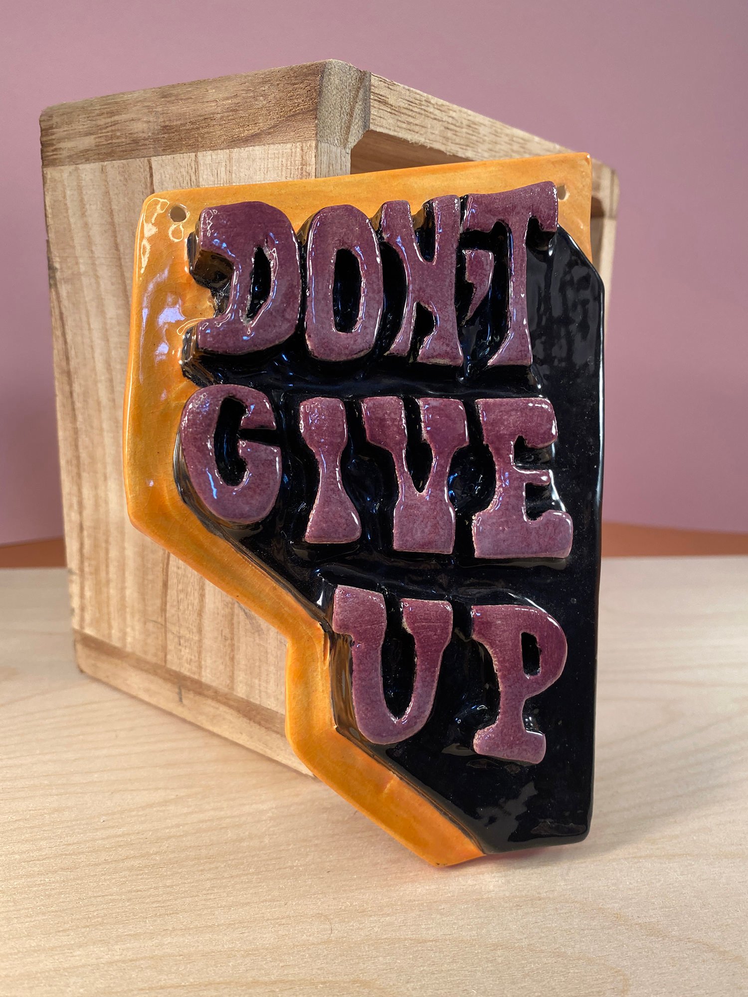 Mon amour du lettering et ma passion de la céramique se rencontrent parfois et ça donne par exemple cette décoration murale (deux clous et hop, c'est accroché) dans un style dynamique, avec son joli dégradé de mauve, sur un fond jaune orangé qui donne la patate, pour nous motiver plus que jamais.